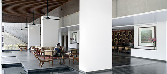 The eastern facade shows the unobstructed connection between inside and outside. The hotel balconies have timber railings on the east and south sides oriented to views out to Varthur Lake in the south.