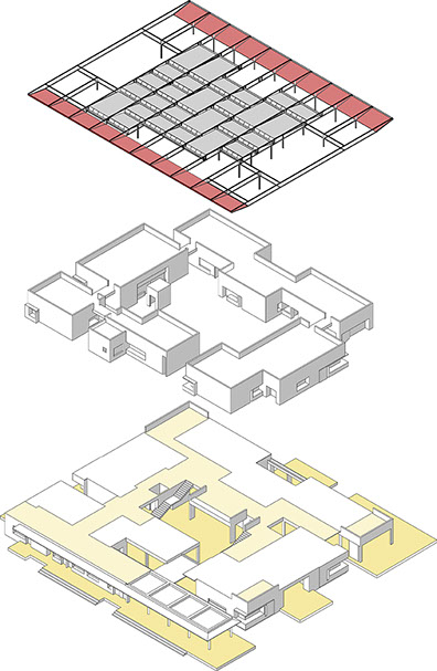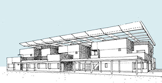 Initial idea of the metal roof as a series of canopies opening out to the north.