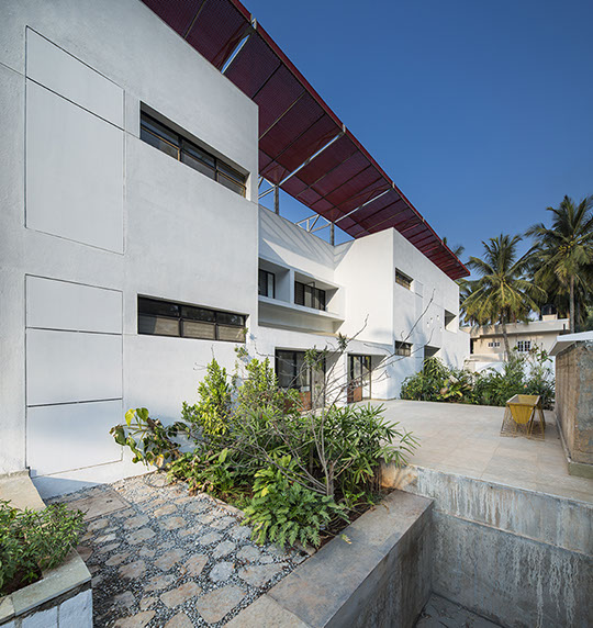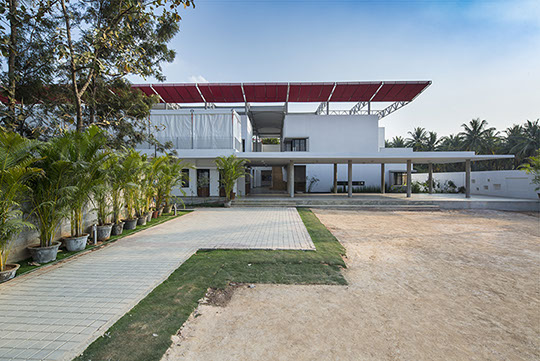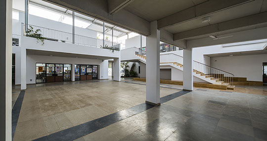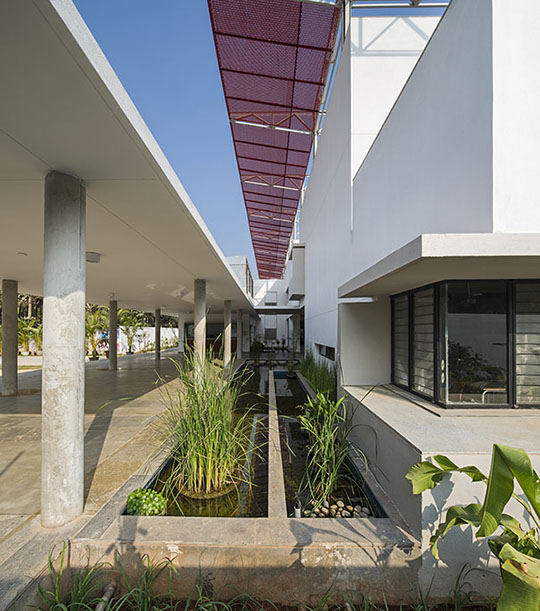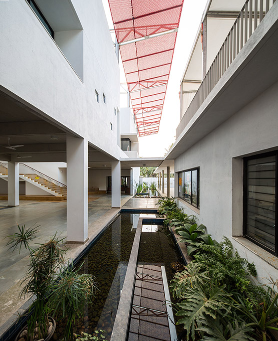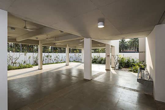 The simple palette of materials(exposed concrete for the slabs and beams, plaster/paint for the walls and Kota on the floors) is clearly articulated. The grid of the structure is reflected in the flooring using rough Kota inlays.