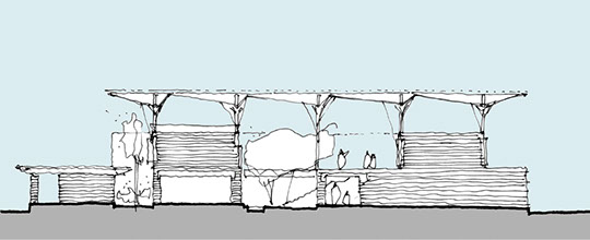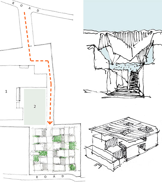 Initial sketches show the idea of a hovering roof, protecting, shading a rich and articulated series of spaces underneath. The school as a place to exchange realizations under the shade of a large tree.