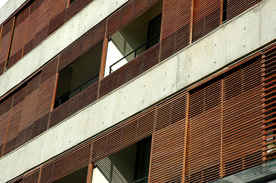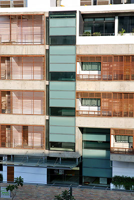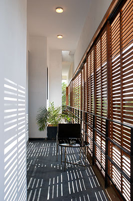 Large balconies ran along the east and west facades and these were encased in sliding teak screens. These enclosed extensions of the rooms work well in Bangalore’s moderate climate. The interiors were done in a palette of local granite, Indian marble and timber.