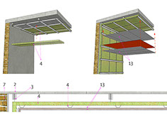 The isolation layer within the brick enclosure (Glasswool + Flexi Ply + Gyspum + timber floor) is very tenuously connected back to the structure of the building to limit sound transfer. This is achieved by using the hangers (3) and rubber mat (1) separators.