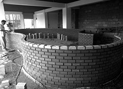 The walls are made of 2”x6”x4 1/2” hollow bricks. They are reinforced with a continuous lintel at 7’. By simplifying the treatment and details around these walls (ceilings, other walls, etc.) the effort is to accentuate the shape and quality of the room enclosures.