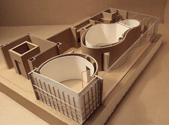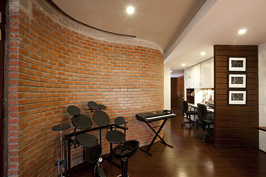 On entering one encounters two separate curvilinear enclosures housing the jam room and the band’s studio. The gap between them is filled in with a delicately attached glass door.